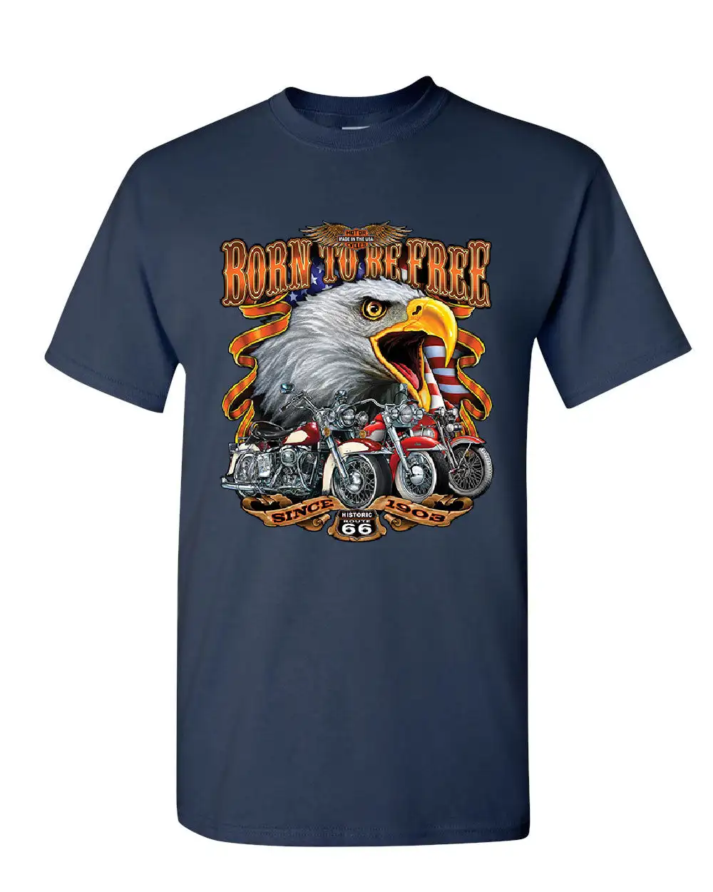 Born To Be Free Historic Route 66 Bald Eagle Motorcycle T-Shirt 100% Cotton O-Neck Short Sleeve Summer Casual Mens T-shirt